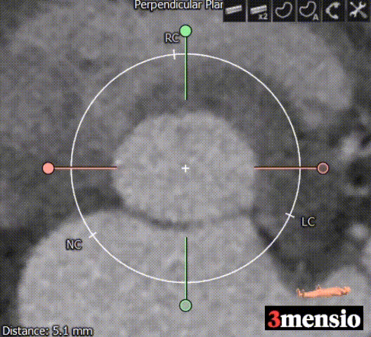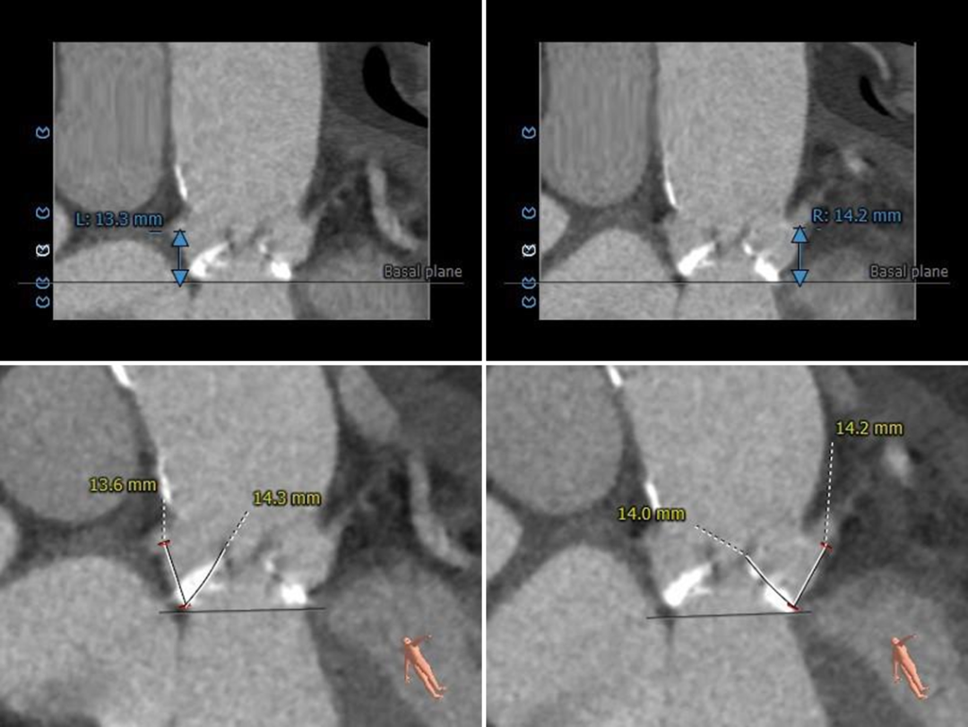 双侧冠脉开口高度可,切线角度测量,左窦瓣叶略长于左冠开口到瓣叶根部距离;