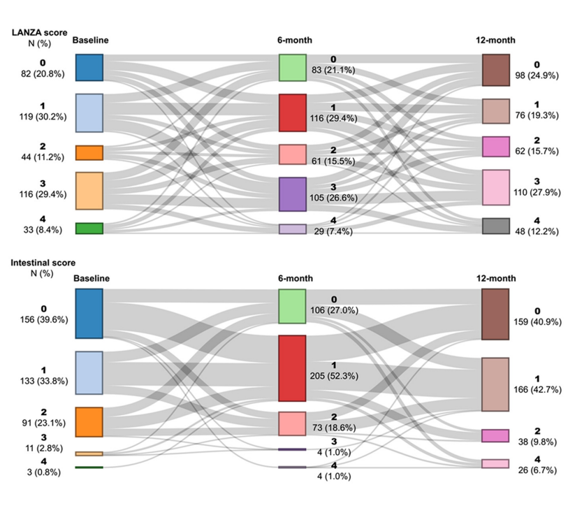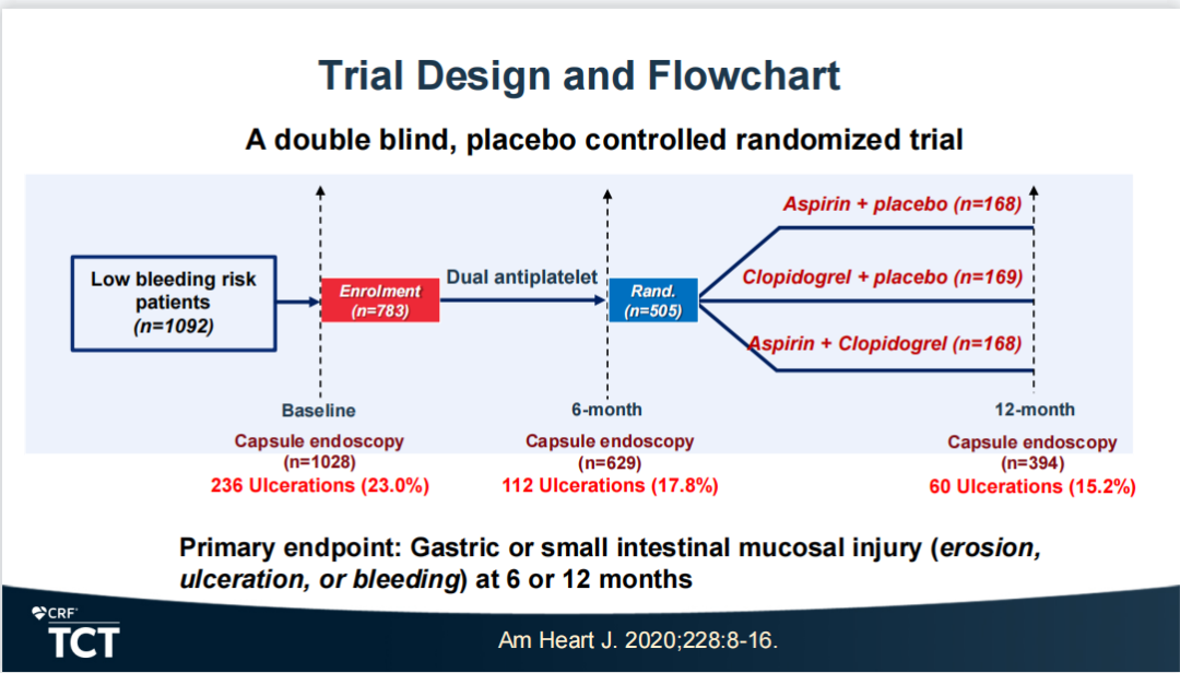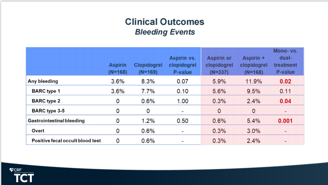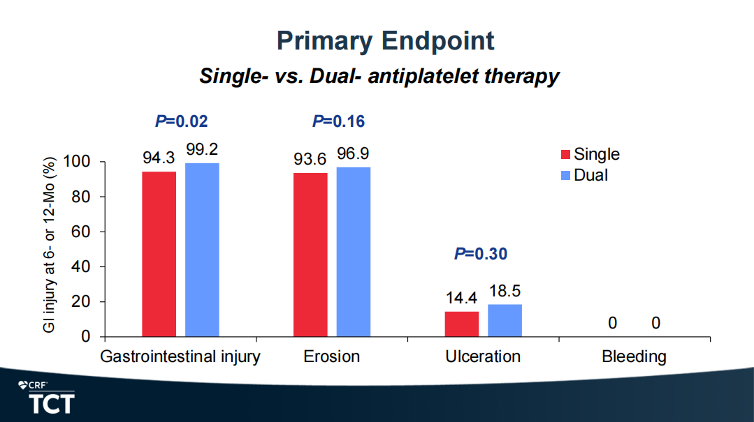 OPT-PEACE随机试验的数据显示:早期所有PCI患者,即使是那些出血风险较低的患者,在接受双重抗血小板治疗(DAPT)时,至少会出现一些胃肠道损伤。然而,那些在6个月后改用单一药物(无论是氯吡格雷还是阿司匹林)的人比那些继续服用DAPT一年的患者胃黏膜的损害更小。然而,DAPT和单一抗血小板疗法(SAPT)在临床上都很少出现明显的消化道出血。