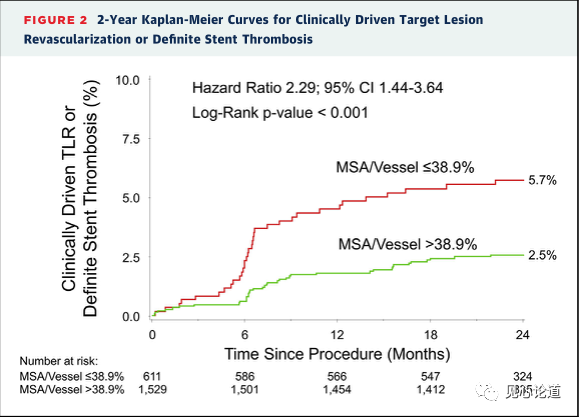 基于对ADAPT-DES研究的亚组分析,MSA/MSA部位血管面积可有效预测患者2年内临床驱动的靶病变再血管化或明确的支架内血栓形成,上述方法在MSA较小的病变中更为有效。