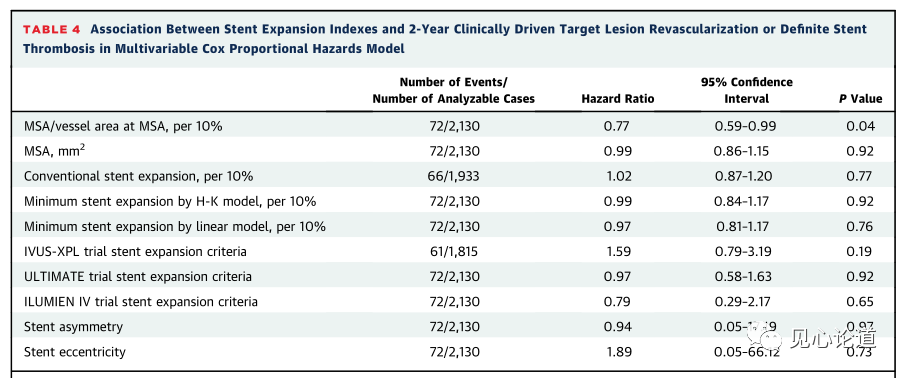 共有1,831例患者的2,140处病变被纳入研究,最终MSA为6.2-2.4 mm²。在10个支架膨胀指数中,只有MSA/MSA部位的血管面积与2年内临床驱动的TLR或明确的支架内血栓形成独立相关(危险比:0.77;95%置信区间:0.59-0.99;P¼0.04)。