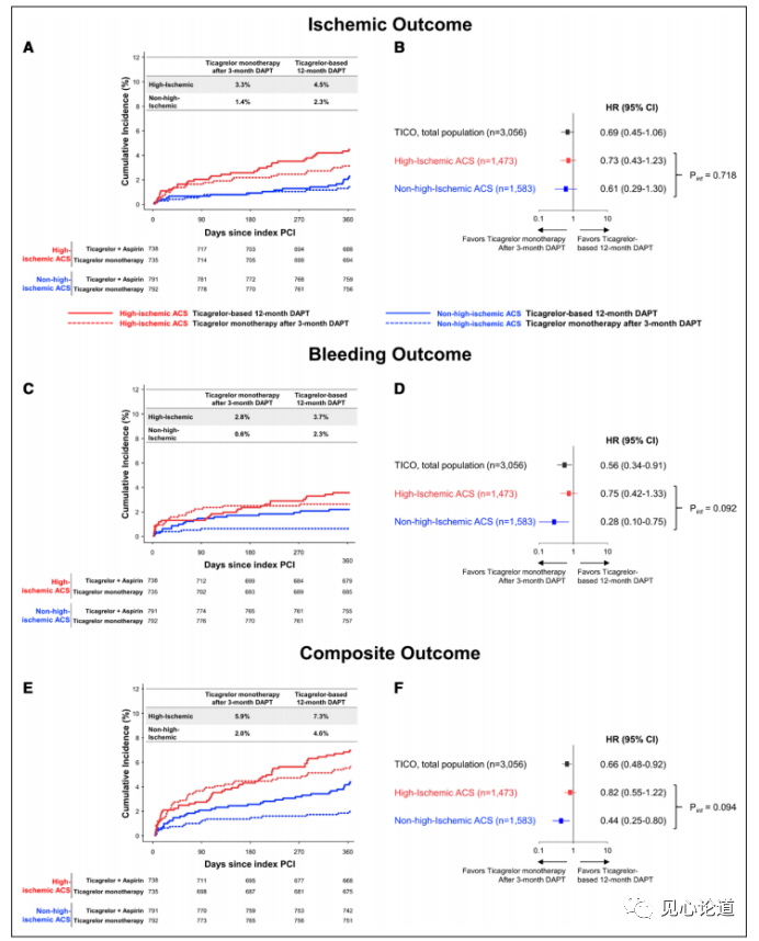 对于存在高缺血风险的ACS患者,3个月DAPT后替格瑞洛单药治疗与以替格瑞洛为基础的12个月DAPT对临床结局的影响没有显著异质性。