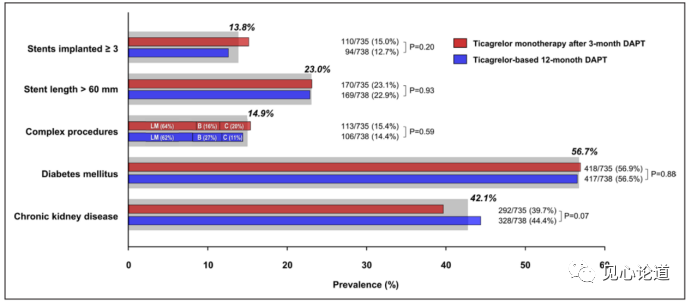 本研究发现:无论是高缺血风险组,还是非高缺血风险组,两种抗板治疗方案患者在基线特征方面并无差别。(见图2)