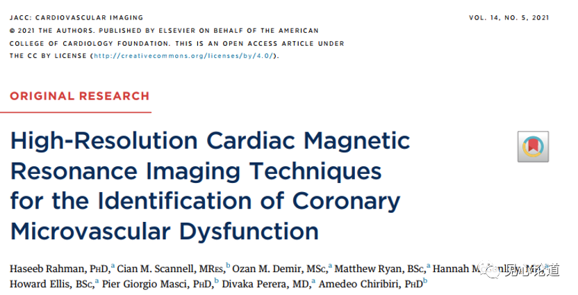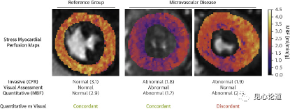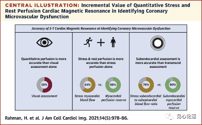 约有一半的心绞痛患者的心外膜冠脉血管是没有明显狭窄的(狭窄直径<30%)或没有缺血(ffr>0.80),这部分患者中有相当一部分存在冠脉微循环功能障碍(coronary microvascular dysfunction,CMD),并且研究表明,患有CMD的人群其发生MACE事件风险更高。目前诊断CMD一般都需要在冠脉造影时进行有创性生理评估(如CFR、IMR等),而心脏MR可以对心肌血流量进行无创性的半定量分析。既往影像科医师多用肉眼评估心脏MR上是否存在心肌灌注异常,而此种肉眼评估的方法对CMD的诊断准确性是未知的。