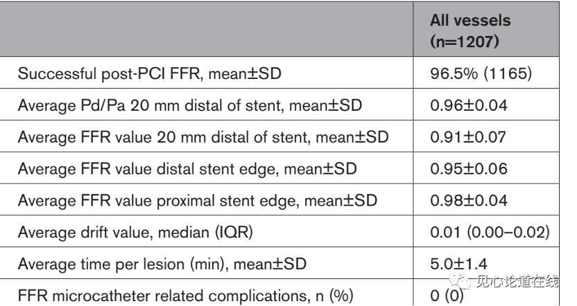 本研究总共纳入了956名患者,1165支干预血管。研究没有观察到与压力导丝使用相关的并发症。共有440支(37.8%)血管的PCI术后FFR<0.90。从患者角度来说,PCI术后即刻FFR<0.90的患者并发高血压、高脂血症、糖尿病的比例更高。而从血管角度来说,PCI术后即刻FFR<0.90的血管钙化病变发生率更高,血栓发生率更低。