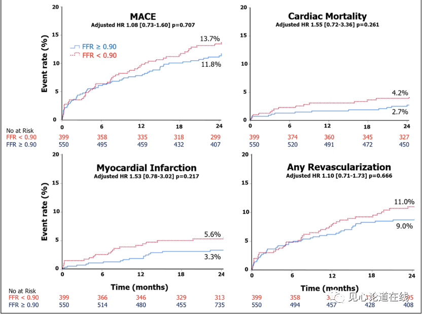 有接近1/3的患者的PCI术后即刻FFR<0.90。PCI术后FFR<0.90对患者的MACE事件发生率没有显著影响,但此类患者后续靶血管血运重建率更高。