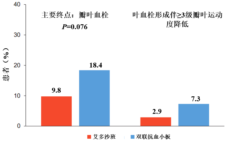 艾多沙班组中有10名患者(9.8%)出现至少1次瓣叶血栓形成,3名患者(2.9%)出现瓣叶血栓形成伴≥3级瓣叶运动度降低;而DAPT组中有20名患者(18.4%)有瓣叶血栓形成,8名患者(7.3%)出现瓣叶血栓形成伴≥3级瓣叶运动度降低。