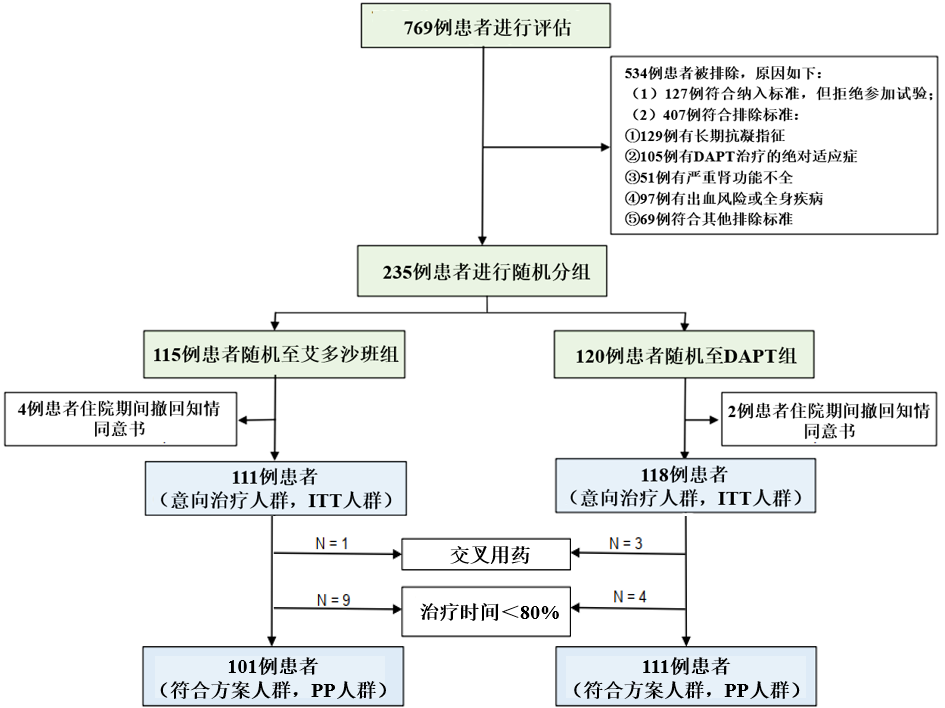 该研究排除标准如下:(1)任何确定的抗凝适应征(例如心房颤动等);(2)任何确定的DAPT绝对适应征(例如,急性冠脉综合征或近期PCI治疗);(3)严重肾功能不全导致不能耐受CT检查(例如eGFR<30ml/min);(4)存在阿司匹林、氯吡格雷或艾多沙班的禁忌症;(5)已知的出血体质;(6)3个月内罹患脑卒中;(7)中、重度肝功能损害或任何与凝血障碍相关的肝脏疾病;(8)任何活动性恶性肿瘤。