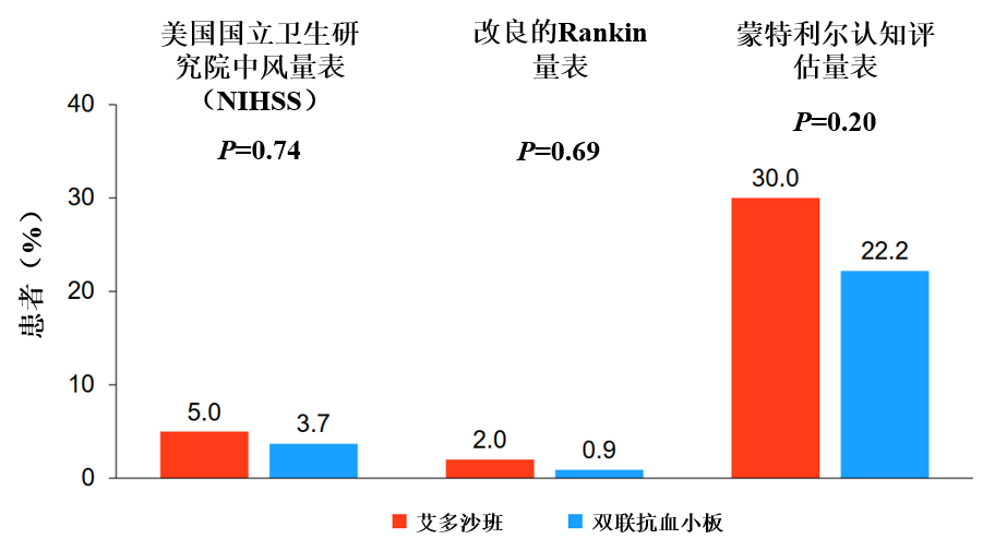 艾多沙班组和DAPT组的连续神经功能检查恶化的患者百分比相似(NIHSS:5.0% vs. 3.7%;改良Ranki量表:2.0%和0.9%)。神经认知功能恶化的患者比例也相似(蒙特利尔认知评估:30.0% vs. 22.2%)。