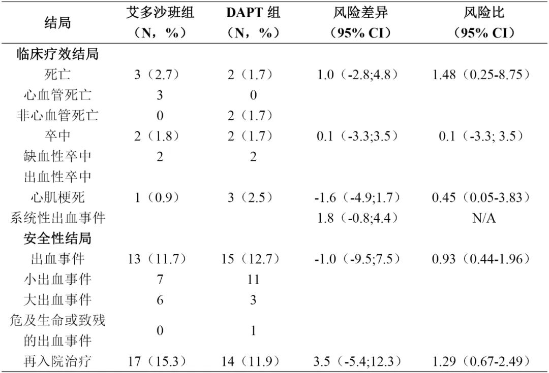 艾多沙班组和DAPT组的临床疗效终点(包括死亡、心肌梗死、卒中或系统性血栓栓塞事件)发生率均低于3%,并且两组之间没有统计学差异。只有4名患者出现临床上明显的缺血性卒中(艾多沙班组2名和DAPT组2名)。两组之间任何或大出血事件的发生率也没有差异。