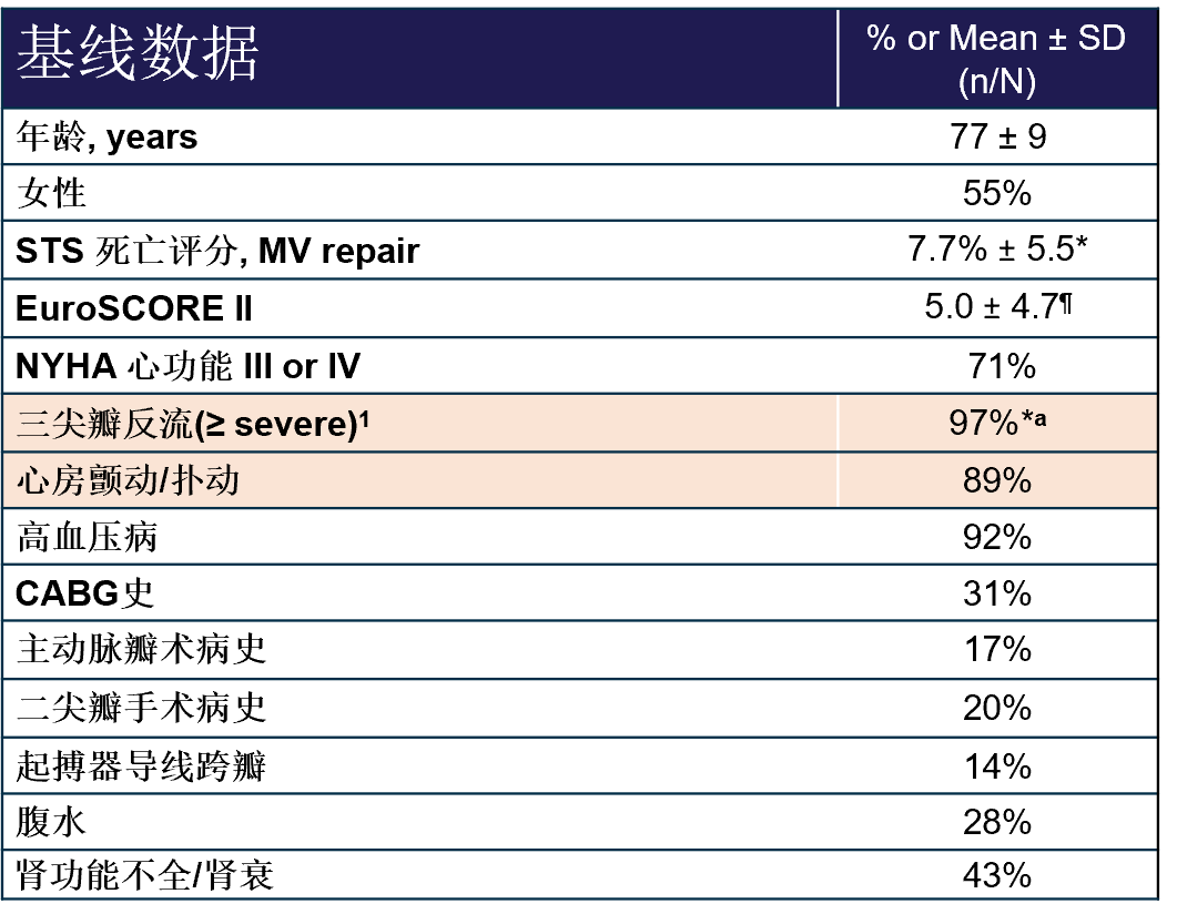 Greenbaum介绍了三尖瓣反流程度与临床死亡率明显相关(图一),并介绍了研究使用的PASCAL钳夹系统的设计特点(图二),CLASP-TR研究设计(图三)。CLASP-TR试验共招募了65名有明显症状的TR患者。基线数据显示14%的患者有起搏器/植入式心律转复除颤器,89%有房颤,53%有肺动脉高压,43%有肾功能不全,其中70%的患者尽管有最佳的药物治疗,但TR评分仍为“massive巨大”或“torrential急流”级别。患者的基线平均STS死亡评分(二尖瓣修复评分)7.7%,应该多数为外科手术高危患者(图四、五)。该团队评估了1年内的主要不良事件和超声心动图、临床和功能终点。