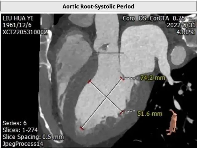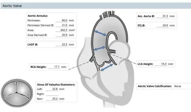 主动脉瓣环内径:21.5mm;主动脉窦部内径:28mm;升主动脉内径:23.4mm;
