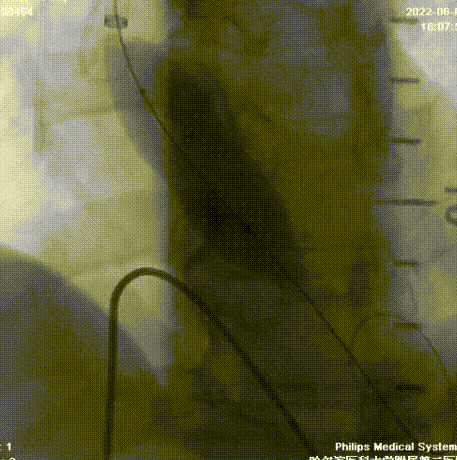 股入路血管分叉高度可,无迂曲,两侧血管存在支架