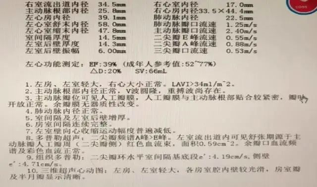 术后24h超声显示:瓣口流速: 2.4m/s;LVEF值:39%;人工瓣膜紧密贴合根部,功能正常 、心衰情况显著改善。