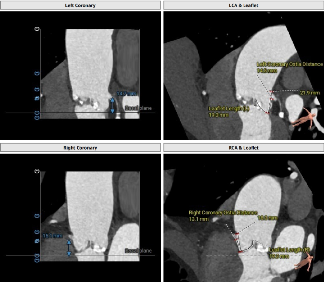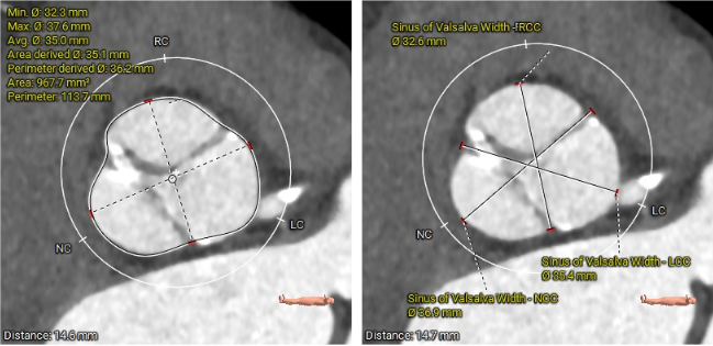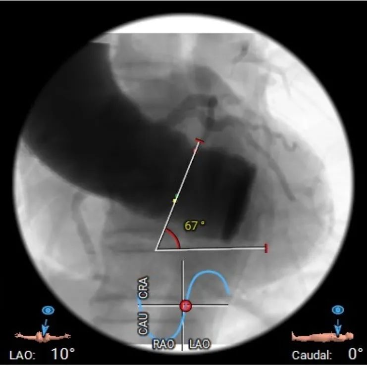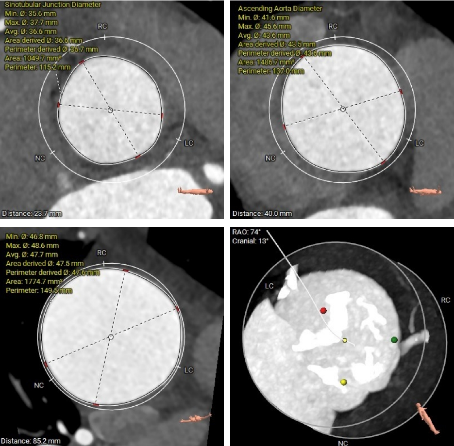 患者心脏水平夹角偏大,升主动脉存在扩张,器械进入存在一定血管损伤风险,瓣膜释放同轴性可能欠佳;