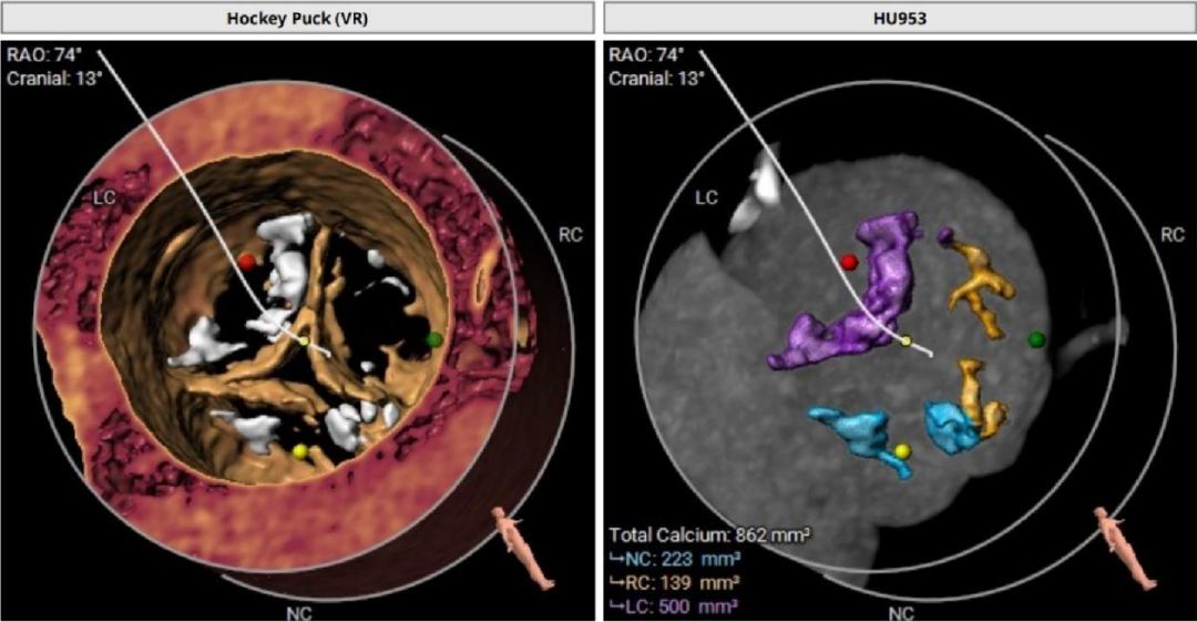 瓣叶重度钙化合并增厚,钙化分布不均,主要集中于左冠窦内。