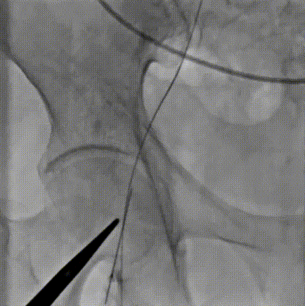 1.以左侧股动脉为辅路,造影指导下穿刺右侧股动脉为主入路;
