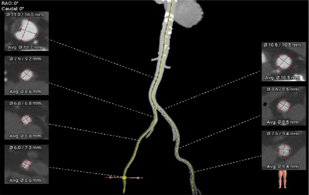 · 外周走行适宜,降主及胸主动脉存在散在钙化,左侧股动脉分叉稍高,血管内径可,血管内壁存在钙化和不规则纤维增厚,入路穿刺规范操作,小心通过,避免入路血管损伤及相关并发症。