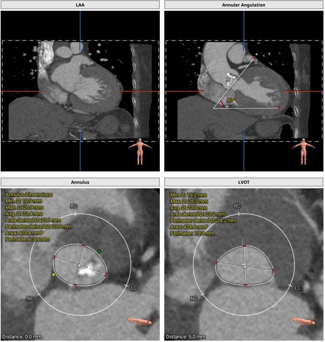 1.Type0型二叶式主动脉瓣,左右冠同窦,瓣叶增厚伴中重度钙化,钙化主要分布于无窦与左窦交合缘及瓣叶边缘,LVOT呈类直筒状形态,预估人工瓣膜会有较明显形变,有根部撕裂、损伤风险;左室流出道提供辅助锚定,综合预估瓣膜锚定定位精度要求较高,人工瓣膜位移风险适中,瓣中瓣风险适中;