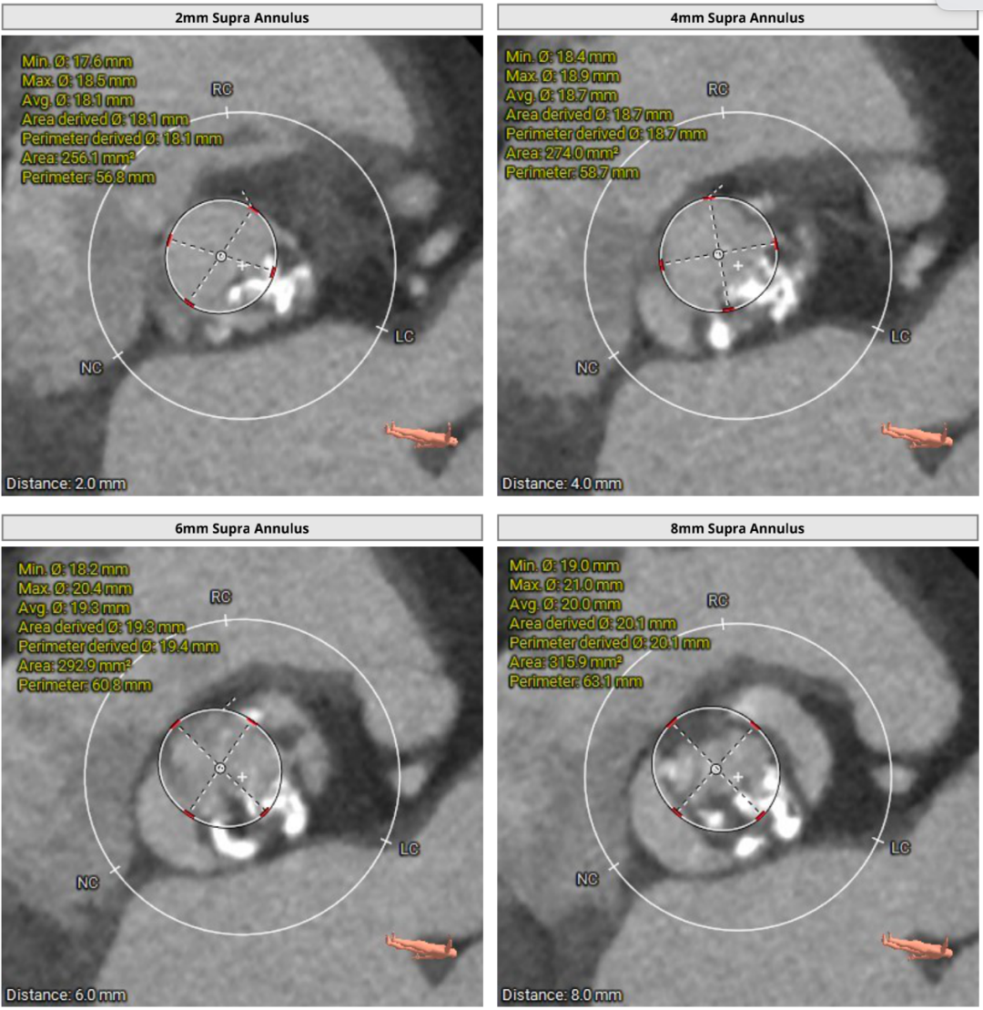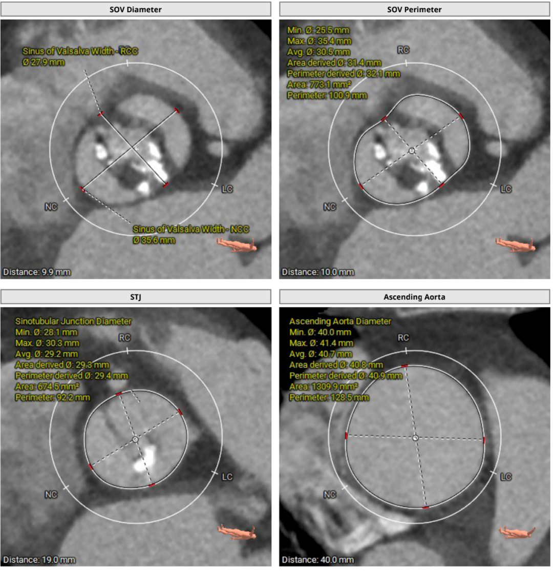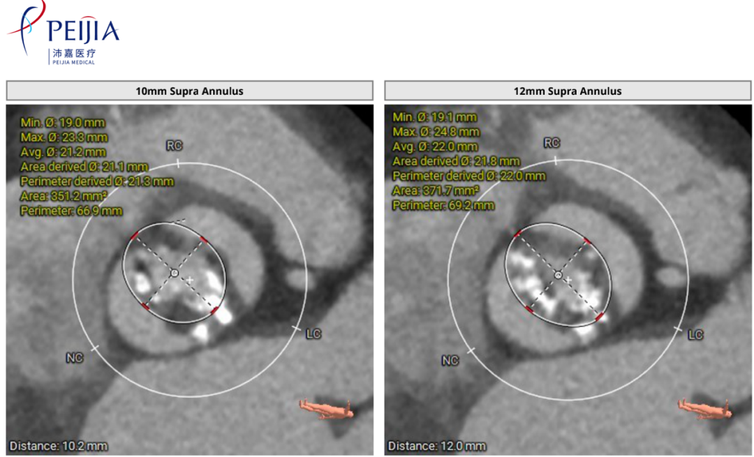 2.冠脉开口高度尚可,左冠瓣叶稍冗长,切线位左冠瓣叶长度稍大于冠脉开口到瓣叶根部附着缘距离,综合分析冠脉堵塞风险尚可,术中密切关注冠脉血流灌注;