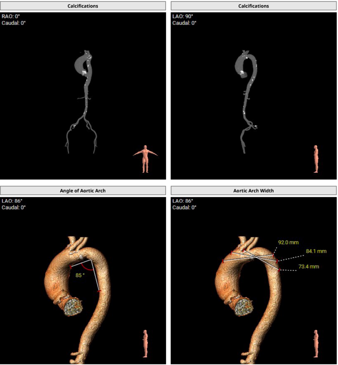 4.横位心,主动脉弓距及夹角尚可,升主动脉扩张,警惕血管夹层、破裂等风险;综合预估输送系统过 弓难度适中,跨瓣难度适中,必要时辅助以snare过弓跨瓣;
