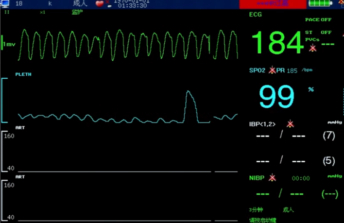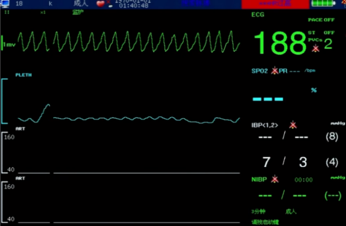 交换超硬导丝到左心室后随即发生室颤,立即给予除颤和胸外心脏按压。