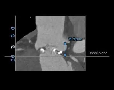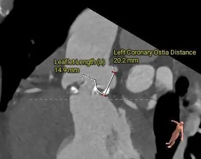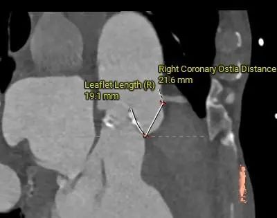 1.CT数据显示该患者为TYPE1二叶式主动脉瓣,瓣叶增厚伴中重度钙化,右无瓣之间有钙化嵴,钙化主要分布在瓣叶上。