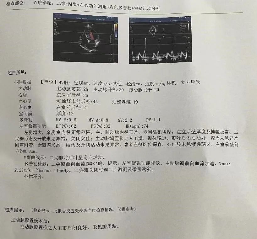 术后一周复查超声平均压差是11mmHg,无瓣周漏,瓣膜正常工作。