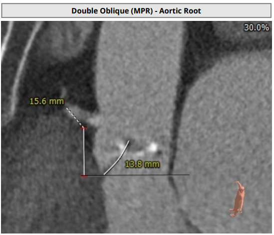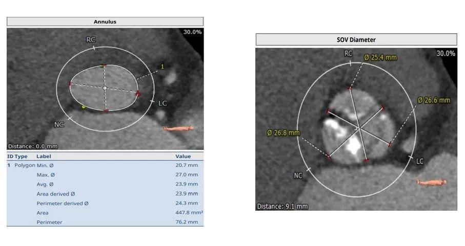 仔细分析对比完临床上常见的几款瓣膜系统后,最终团队决定选用SAPIEN 3瓣膜。首先是因为SAPIEN 3瓣膜系统所使用的输送鞘管是临床上常用瓣膜产品中最细的一款。其次,CT评估出患者冠脉开口处存在风险,球扩瓣也能帮助降低TAVR手术对冠脉开口的影响。