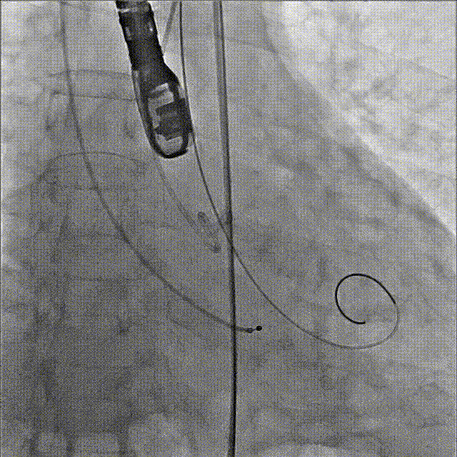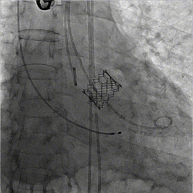 6、造影确定瓣膜到位,180bpm快速起搏下精准释放瓣膜;