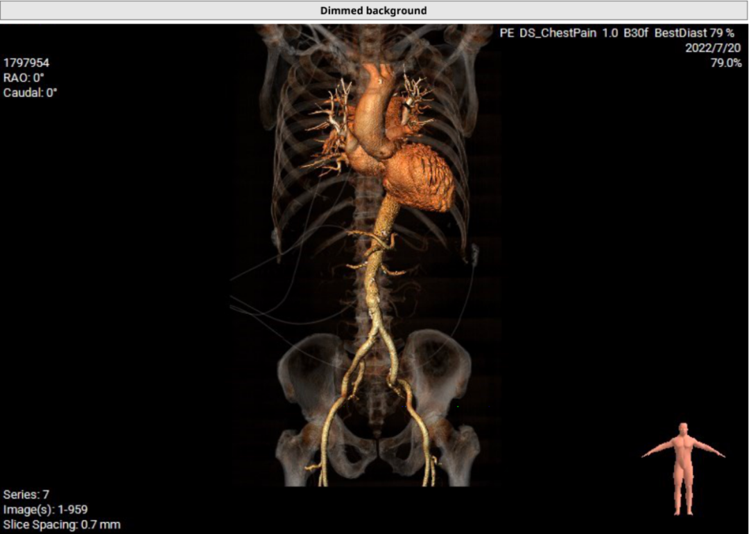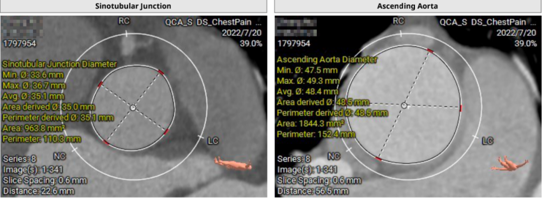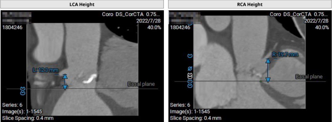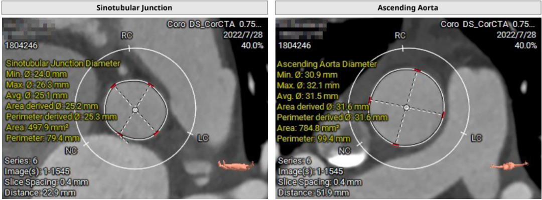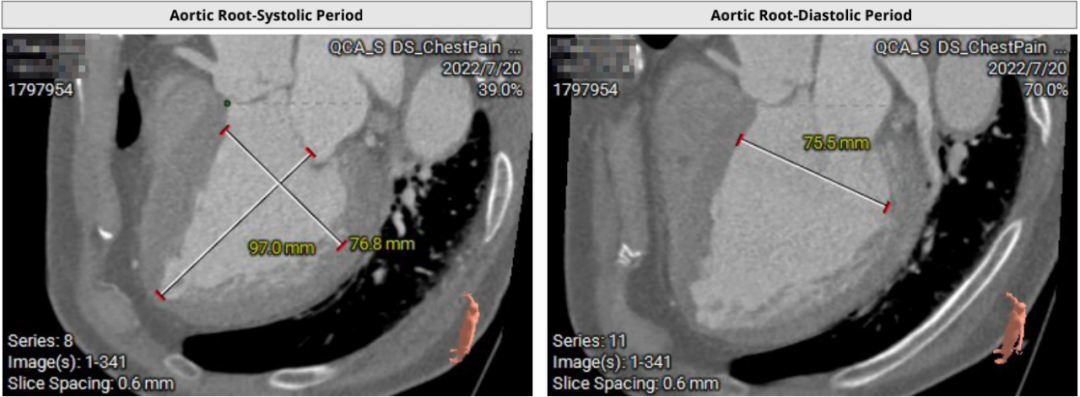 患者64岁男性,Type 0 型二叶瓣、横位心。主动脉瓣中度狭窄,重度反流,瓣环周长92.0mm,平均径29.0mm。LVOT周长98.7mm,升主扩张,窦部结构极限,锚定能力极限。入路两侧血管轻度迂曲,分叉高度可,两侧血管内径均>8mm。