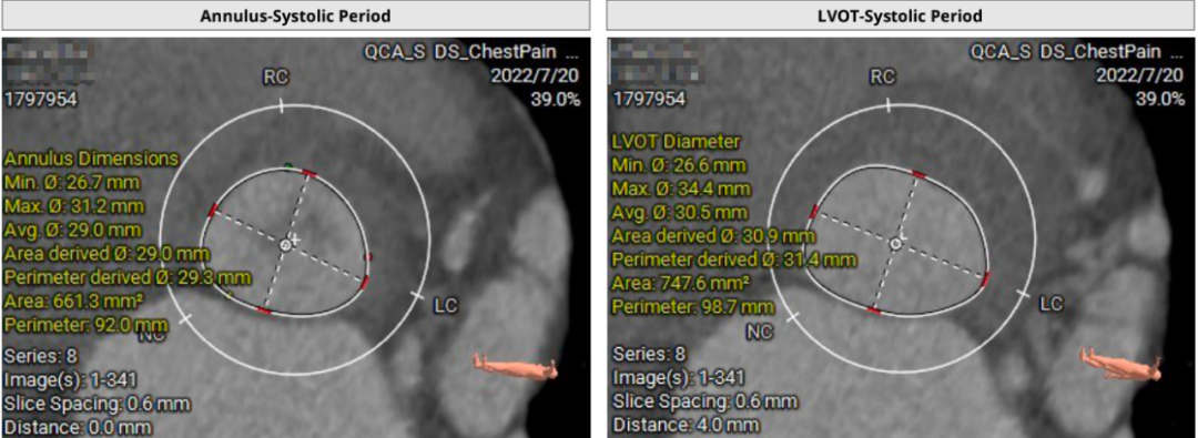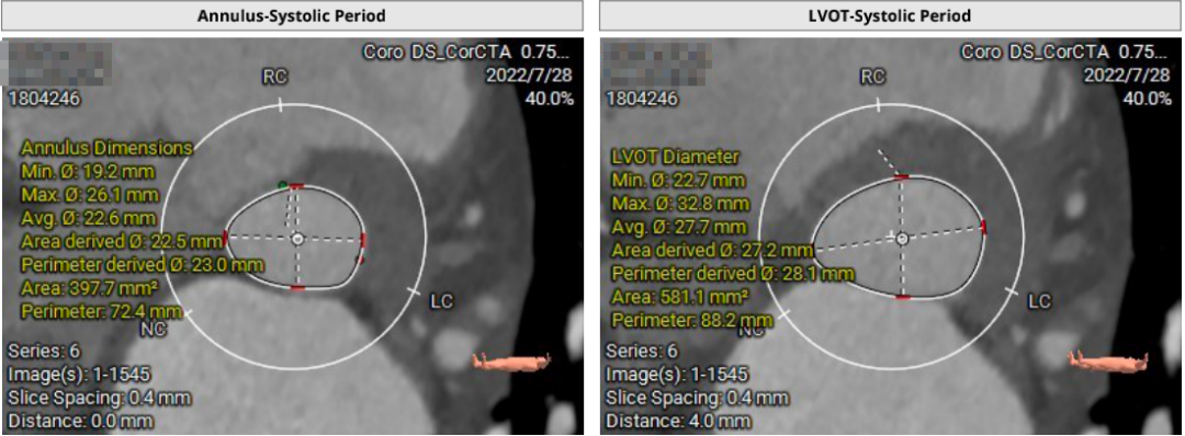 患者71岁女性,诊断为主动脉瓣重度狭窄合并心功能不全,瓣口面积仅0.5cm²,跨瓣压差超过50mmHg,且EF仅27%,心功能极差。术前CT检查瓣环周长72.2mm,LVOT呈喇叭型。CT检查同时发现患者入路血管狭窄,股动脉直径5.3cm,锁骨下和颈内动脉直径都小于5.0cm,对操作造成了一定困难。