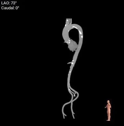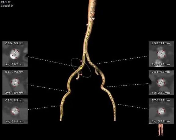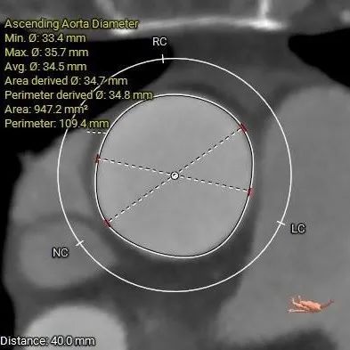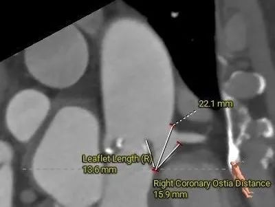 • 冠脉开口高度尚可,切线角度测量,无冗长瓣叶;冠脉远端有钙化分布;