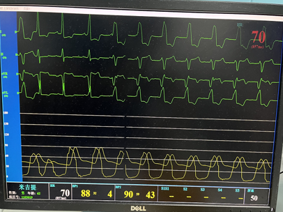 经彩色多普勒超声:EF:47%,主动脉瓣叶增厚,右、无冠瓣交界处粘连,呈二叶式开放,收缩期瓣口开放受限,测瓣口开放间距6mm,开放面积约0.9cm²,主动脉瓣上湍流,Vmax488cm/s,PGmax95mmHg。超声诊断:二叶式主动脉瓣(TypeI型)伴狭窄(PGmax95mmHg)并关闭不全及钙化、瓣下反流(大量);二尖瓣反流(大量);三尖瓣反流(少量)。