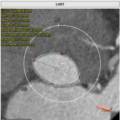 ● 综合预估瓣膜锚定难度尚可,瓣膜植入受钙化融合嵴影响,存在瓣膜移位、形变的可能性,存在瓣周漏及瓣中瓣风险;