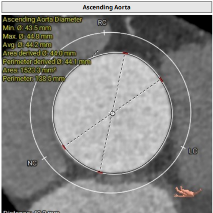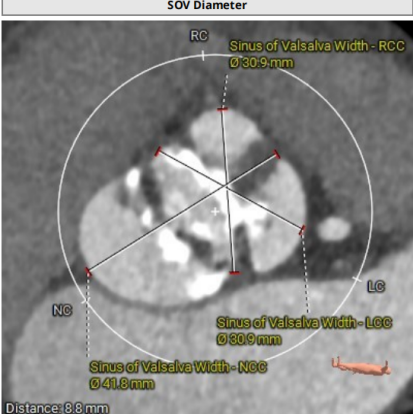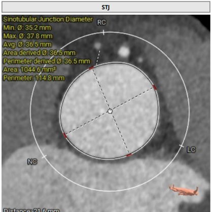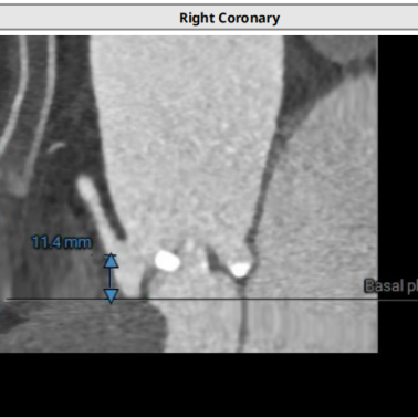 ● 左右冠脉开口高度尚可,切线位左右冠瓣叶长度>冠脉开口到瓣叶附着缘距离;
