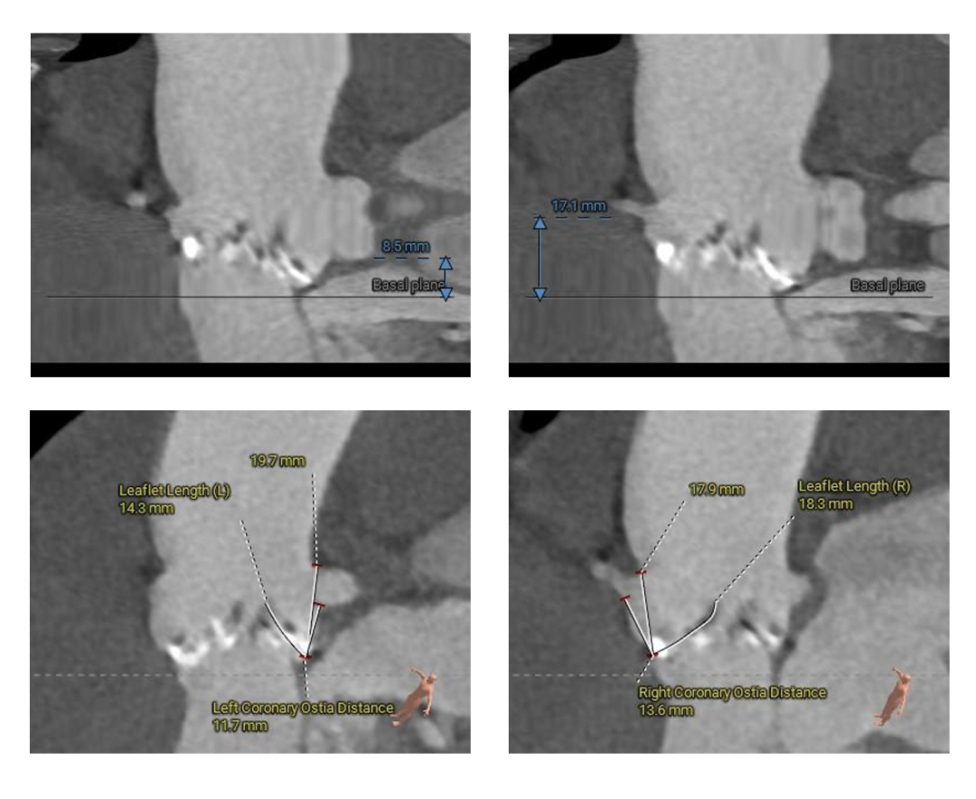 Type-0型二叶瓣,中-重度钙化伴瓣叶增厚,左冠开口高度偏低,右冠开口高度可,左冠瓣叶长度略大于冠脉开口上缘与瓣叶附着缘距离,左室流出道整体呈直筒型,瓦氏窦,窦管交界,升主动脉内径可,左室腔内径可,心室壁增厚,主动脉瓣环与水平面夹角51度,非横位心,主动脉弓距、弓角可 -双侧入路血管走形良好,整体入路条件可