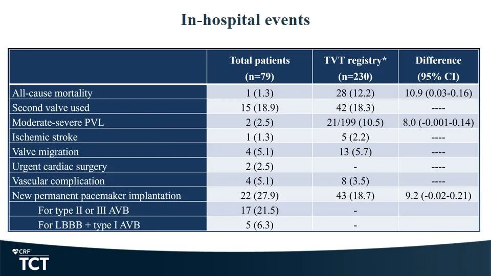 SEASON-AR多中心、注册研究共纳入79例重度单纯主闭患者,分别来自南京市第一医院、武汉大学人民医院、厦门市心血管病医院、武汉亚心总医院及江西省人民医院,这些患者均接受了经股动脉自膨瓣的TAVR治疗,平均STS评分为6.03%,其住院期间死亡率和6个月内全因死亡率分别为1.3%和5.1%。这一数据明显优于既往的STS/ACC经导管瓣膜治疗登记数据(TVT登记数据)结果(TVT登记数据显示使用自膨瓣治疗的重度主闭患者的院内全因死亡率为12.2%)。