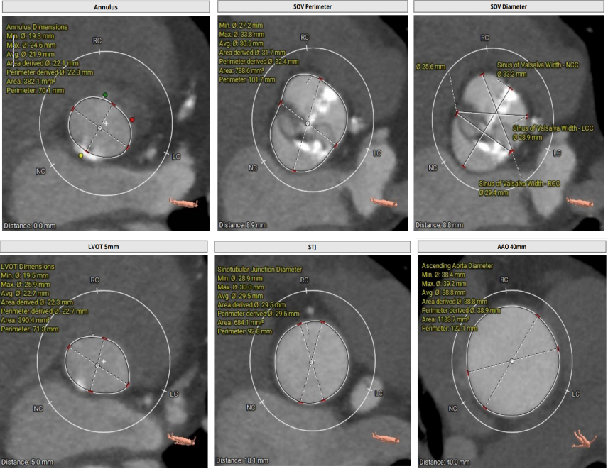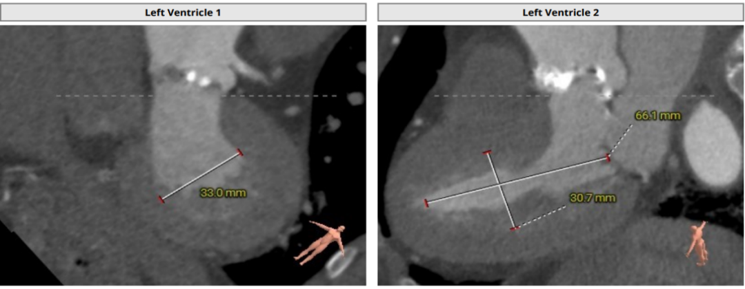 左右冠脉开口高度尚可,左右冠瓣叶冗长,切线位测量瓣叶大于冠脉开口下缘距离;左主干及回旋支局部钙化,综合评估瓦式窦内径及L-R融合嵴、瓣叶钙化等结构影响,植入瓣膜后冠脉风险适中;