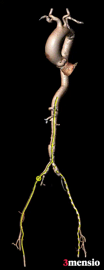 主动脉弓及腹主动脉局部散在钙化,腹主动脉远端及左侧髂总动脉局限性扩张,动脉未见明显扭曲,右侧髂外血管内径偏细;入路规范操作,小心通过,避免入路血管相关并发症。