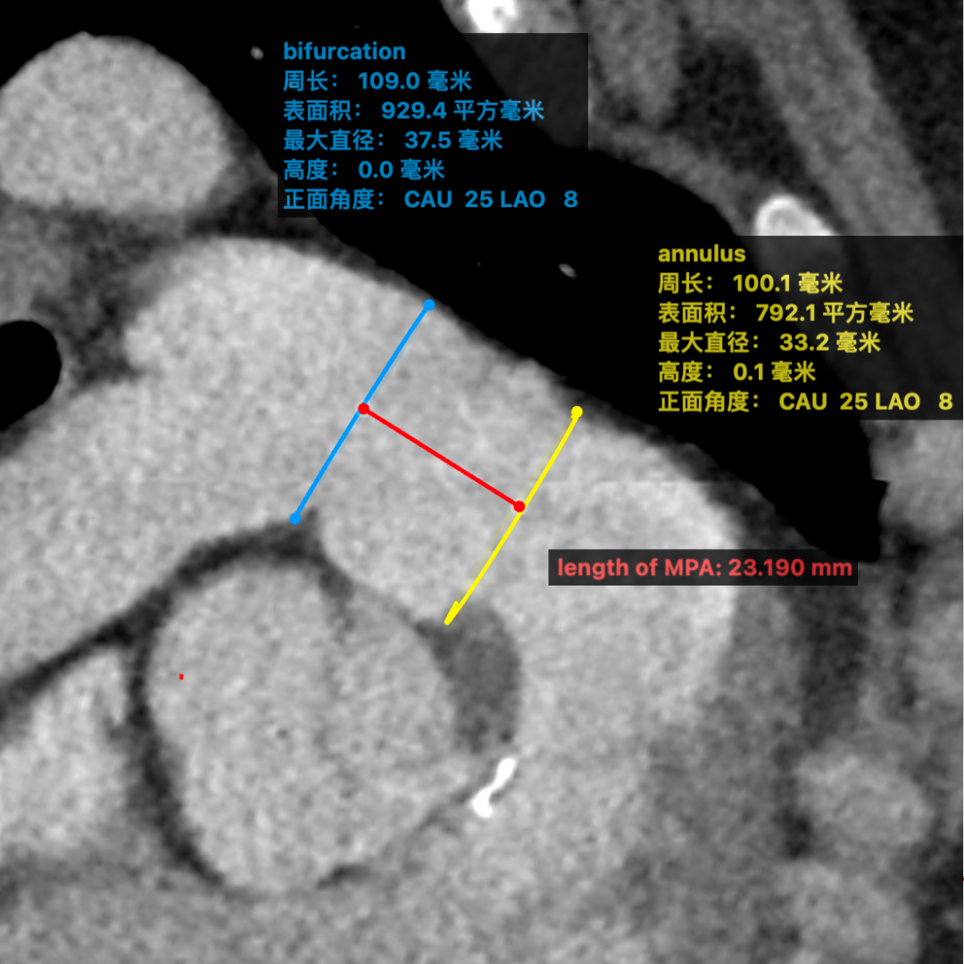 图一:肺动脉瓣环直径32mm,肺动脉分叉处直径35mm,主肺动脉长度23mm