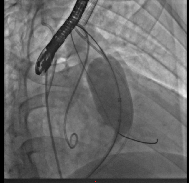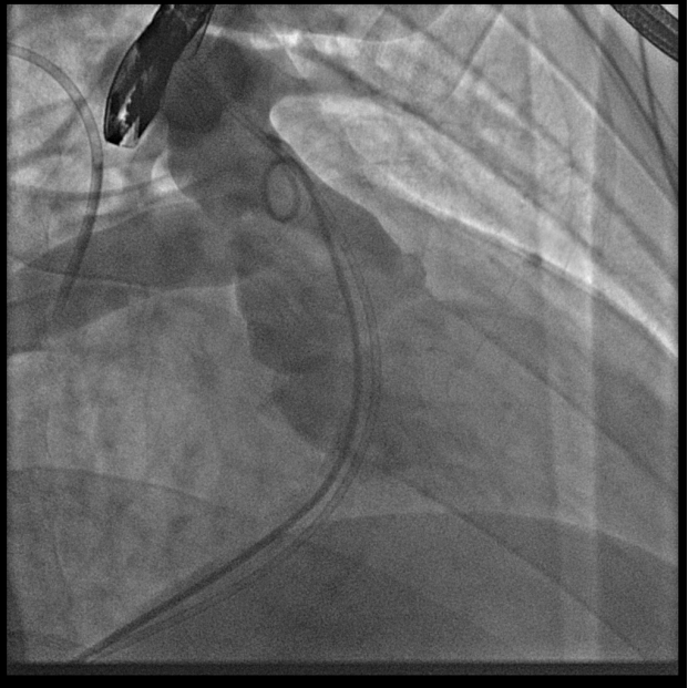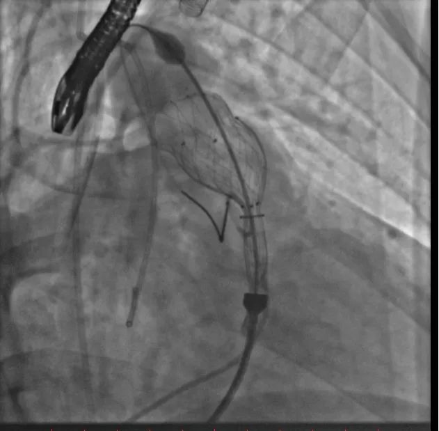 图五:通过PASS技术将球囊送至右肺动脉开口并扩张球囊、完成肺动脉瓣膜支架向心室侧移位,复查造影右肺动脉未见明显阻挡