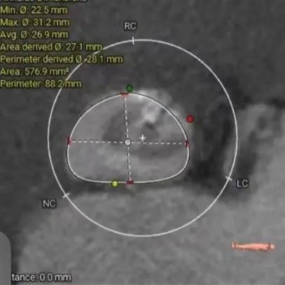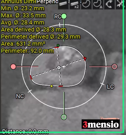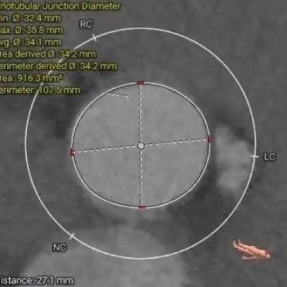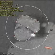 • Type1型二叶式主动脉瓣,瓣环径为28.1mm,瓣环明显增大,瓣叶增厚伴重度钙化,钙化延续左室流出道,左冠窦单叶瓣畸形,LVOT敞口;