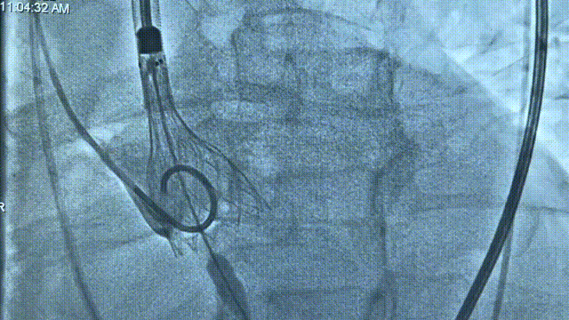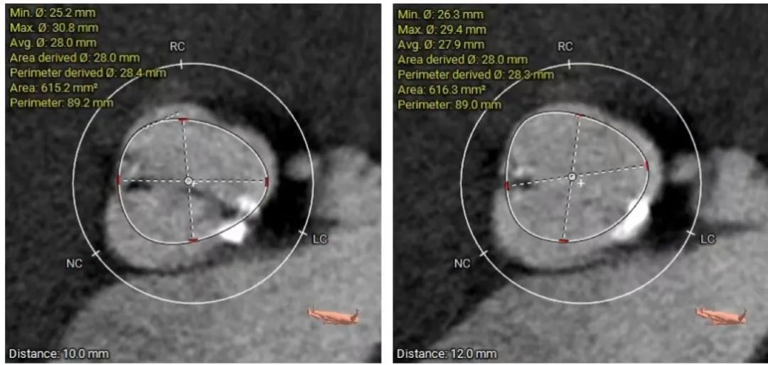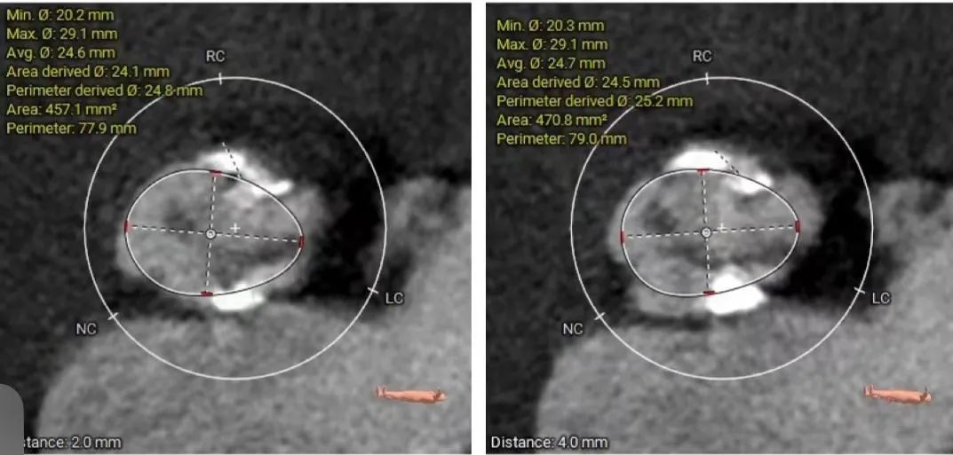 • 使用22mm球囊预扩,预装AV26瓣膜,近左右重合位瓣环下0mm定位释放,释放后多角度观察瓣膜释放形态及植入深度。