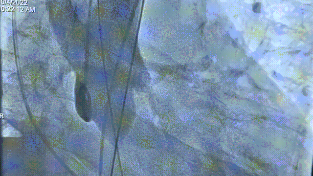 主动脉根部造影,主动脉瓣中度反流,采用22mm球囊预扩,腰征,无造影剂渗漏。