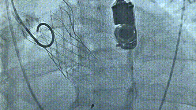 TaurusElite输送系统轻松过弓、跨瓣,AV26瓣膜瓣环下0mm定位释放,到工作位后造影显示瓣膜形态、位置良好,释放脱钩后瓣膜形态、位置良好,冠脉血流灌注正常,无瓣周漏,弓部血管造影未见异常。