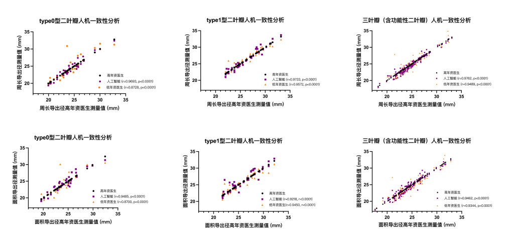 人工智能系统在不同瓣叶分型的病例上表现出与高年资医生测量结果极高的相关性和稳定性