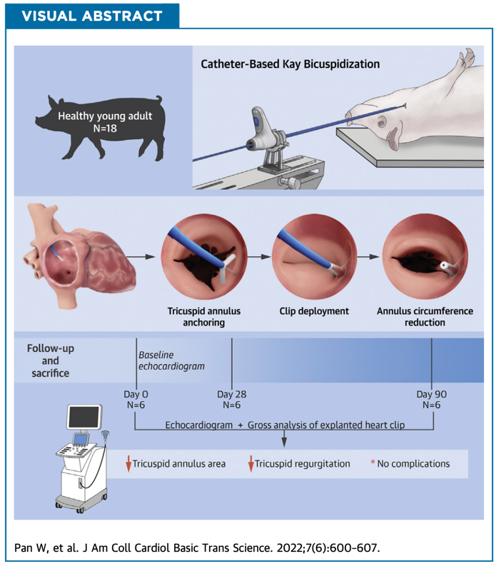 K-Clip器械使用金属夹子巧妙的通过微创介入的方法实现外科三尖瓣环缩的经典术式,并且其操作相比国外器械更为简单。在这项动物实验中,展现出了良好的安全性和有效性。