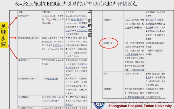 最后,潘教授强调了本共识的五个亮点:亮点1——精炼:表格式精炼概况TEER术中超声操作的要点;亮点2——实用:对TEER术中定位、夹合及夹子释放的标准给予详细的阐述;亮点3——创新:二尖瓣反流功能分型更详细,在Carpenter typeⅡ基础上补充了二尖瓣脱垂合并连枷和假性脱垂,并增加了TypeⅣ型(合并二种病变机制的二尖瓣反流);亮点4——精美:共识附有许多精美图片,便于读者更加直观的理解;亮点5——全面:本共识涵盖经股和经心尖的TEER超声操作,内容全面,同时彰显出中国特色。