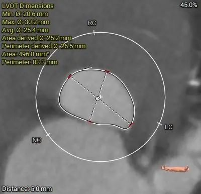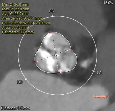 1.三叶式主动脉瓣,中重度钙化,人工瓣膜锚定力尚可,左室流出道呈敞口型,综合多平面分析,预估瓣膜释放后有向下位移风险及瓣周漏可能