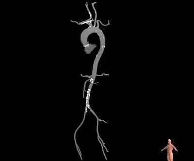 腹主动脉及左右髂总动脉有附壁钙化分布,左右髂外动脉及左右股动脉血管内径稍细,余血管内径可